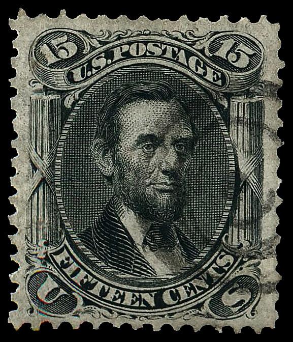 1867, 15¢ black, F. grill (Scott 98), impressive centering with ample margins; small thins, Very Fine to Extremely Fine. Scott $300. (Image)
