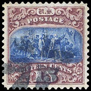 1869, 15¢ brown & blue, type I (Scott 118), a magnificent gem with near perfect centering, bright fresh color and a fairly light circle-of-wedges cancel; faults including reperfing, Extremely Fine appearance. Scott $900. (Image)