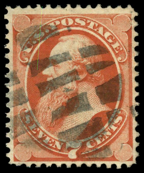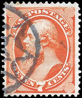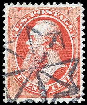 1873, 7¢ orange vermilion, C.B.N.C. printing (Scott 160), nicely centered, with an attractive New York Foreign Mail cancel, almost Very Fine. Scott $90. (Image)