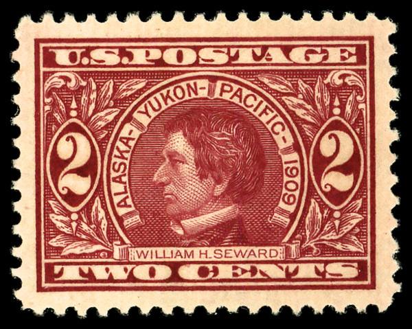 1909, 2¢ Alaska-Yukon (Scott 370), amazingly well centered, but a perf disc indent a lower right keeps this stamp from achieving a higher grade from PSE, o.g., never hinged, Extremely Fine, with 2022 P.S.E. certificate graded XF 90. SMQ XF 90; $40. (Image)