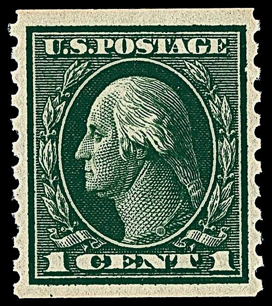 1914, 1¢ green, S.L. watermark, flat plate coil, perf. 10 vertically (Scott 443), o.g., never hinged, Very Fine to Extremely Fine, with 1999 P.F. certificate for strip of 4 which this is the 3rd stamp. Scott $65. (Image)