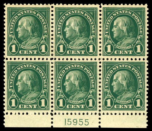 1923, 1¢ Franklin (Scott 552), bottom margin plate block of 6, o.g., top center and top left stamps are hinged, other stamps are never hinged, several very well centered singles at bottom, Fine to Very Fine. Scott $38. (Image)