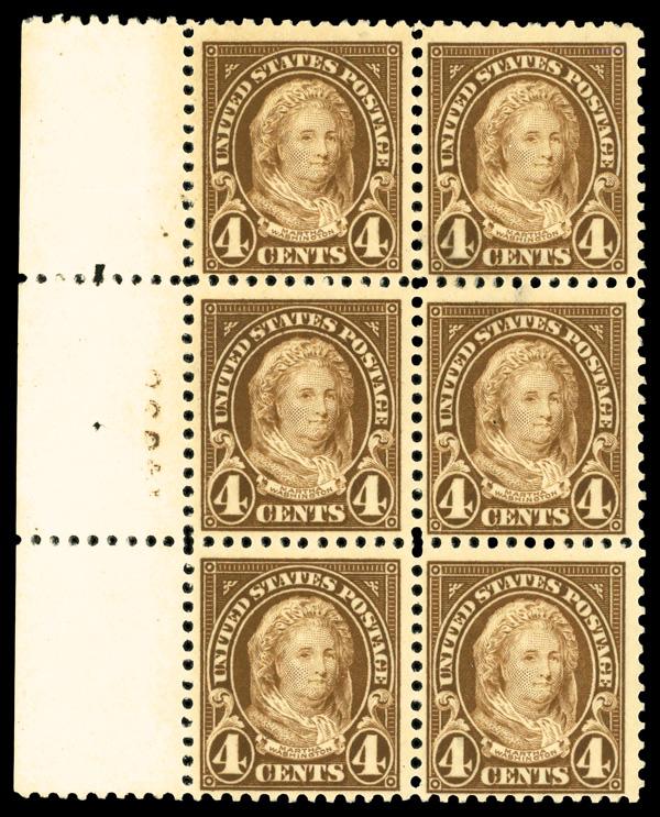 1923, 4¢ Martha Washington (Scott 556), left margin plate block of 6, o.g., right top and center stamps are hinged with small thins, top left stamp is lightly hinged, other stamps are never hinged, fresh color; perf disc indent into bottom right stamp, Fine to Very Fine. Scott $250. (Image)