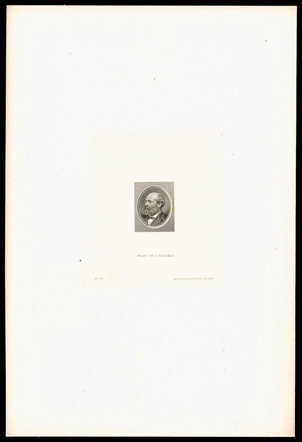 1882, 5¢ Garfield, A.B.N.C. essay, in gray brown (Scott 205-E2), vignette with frame of horiz. lines, die on India, die sunk on card, fresh and crisp as expected, with title, American Bank Note Company New York imprint and die number "C-47" below design; India 70 x 81mm, card 147 x 219mm; the card with a corner crease at top left and a tiny natural paper inclusion, otherwise Very Fine, with 2021 P.S.E. certificate. Brazer 205Ec. Scott $250. (Image)