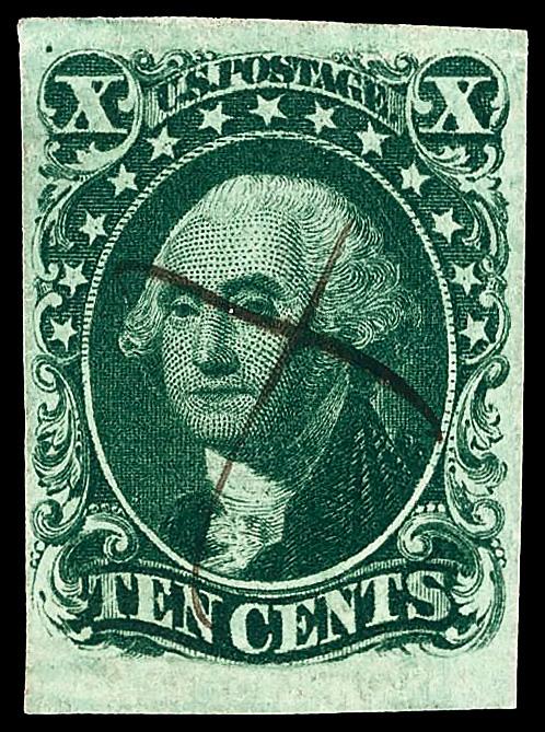1855, 10¢ green, type II (Scott 14), pen cancel; small corner crease UL, Very Fine to Extremely Fine, with 2024 P.F. certificate. Scott $63. (Image)