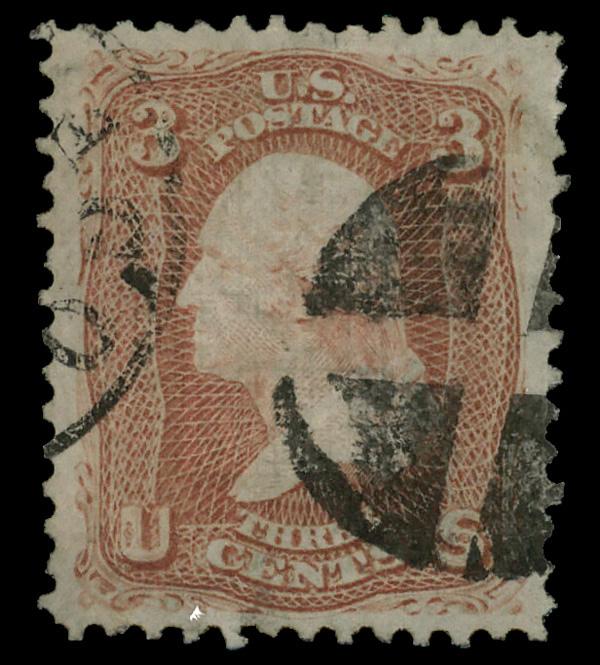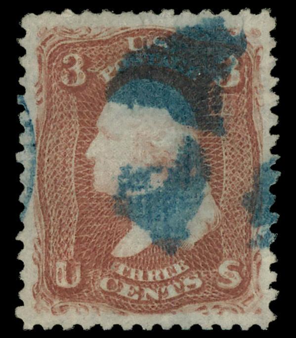 1867, 3¢ rose, E. grill (Scott 88), blue cancel, Extremely Fine. Scott $35. (Image)