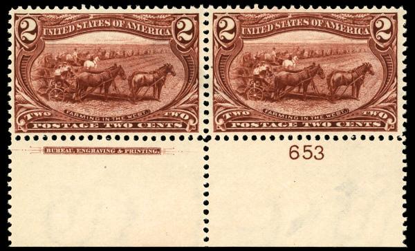 1898, 2¢ Trans-Miss. (Scott 286), plate number pair, o.g., stamps never hinged, thins in selvage only, Very Fine to Extremely Fine. Scott $60. (Image)