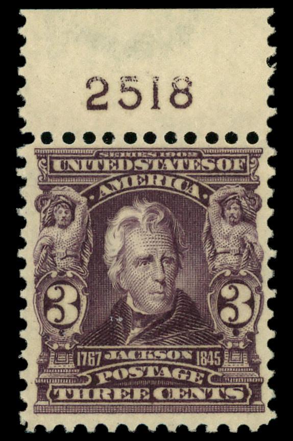 1903, 3¢ bright violet (Scott 302), plate number single, o.g., never hinged, Fine to Very Fine. Scott $140. (Image)