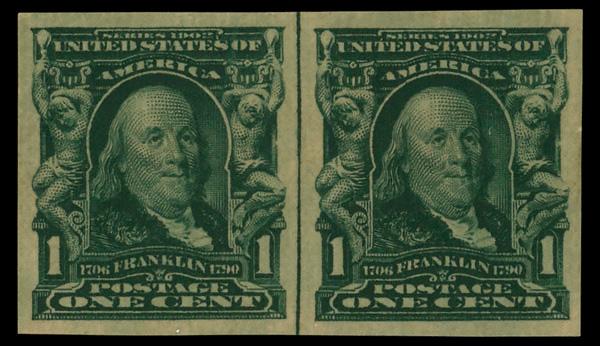 1906, 1¢ blue green, imperf. (Scott 314), pair with vertical guide line between, o.g., never hinged, Very Fine. Scott $55. (Image)