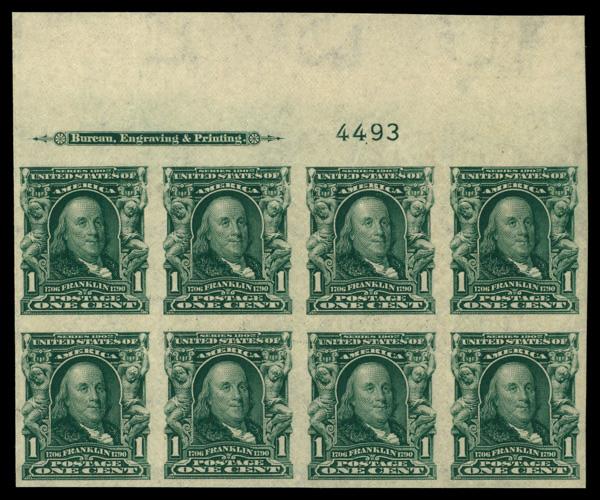1906, 1¢ blue green, imperf. (Scott 314), plate block of 8, o.g., never hinged, Very Fine. Scott $365. (Image)