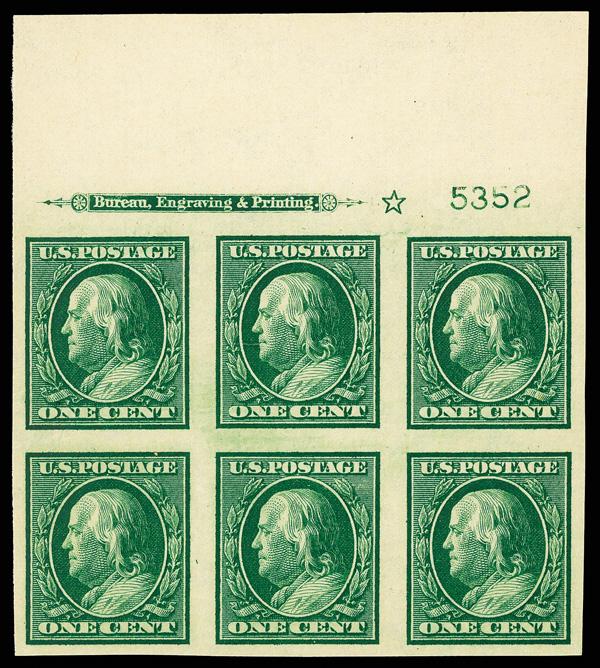1908, 1¢ green, D.L. watermark, imperf. (Scott 343), top margin plate block of 6 with star, Exceptionally rich original hue, o.g., never hinged, Extremely Fine. Scott $98. (Image)