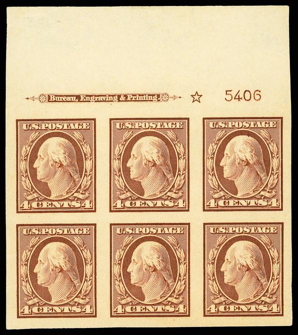 1909, 4¢ orange brown, D.L. watermark, imperf. (Scott 346), top margin plate block of 6 with star, Immaculately fresh, o.g., lightly hinged, Extremely Fine. Scott $210. (Image)
