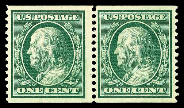 1909, 1¢ green, D.L. watermark, coil, perf. 12 vertically (Scott 352), pair (3mm spacing), remarkably scarce variety, o.g., very lightly hinged, Fine to Very Fine, with 1984 P.F. certificate. Scott $250. (Image)
