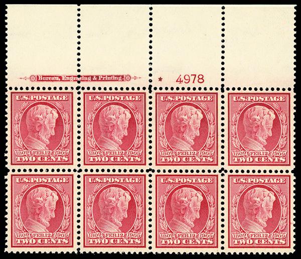 1909, 2¢ Lincoln (Scott 367), top margin plate block of 8 with small solid star, Preserved with utmost care, o.g., never hinged, Very Fine. Scott $294. (Image)
