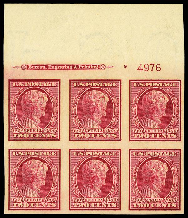 1909, 2¢ Lincoln Centenary, imperf. (Scott 368), top margin plate block of 6 with small solid star, Bright with vivid tones, o.g., never hinged; light gum wrinkles, Very Fine. Scott $390. (Image)