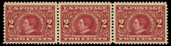 1909, 2¢ Alaska-Yukon (Scott 370), strip of 3, o.g., never hinged, Fine to Very Fine. Scott $45. (Image)