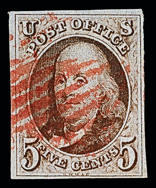1847, 5¢ red brown (Scott 1), clean and sound four-margined example with red grid cancel, Fine, with 2020 P.S.E. certificate. Scott $425. (Image)