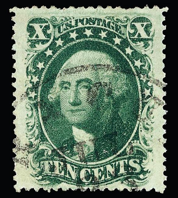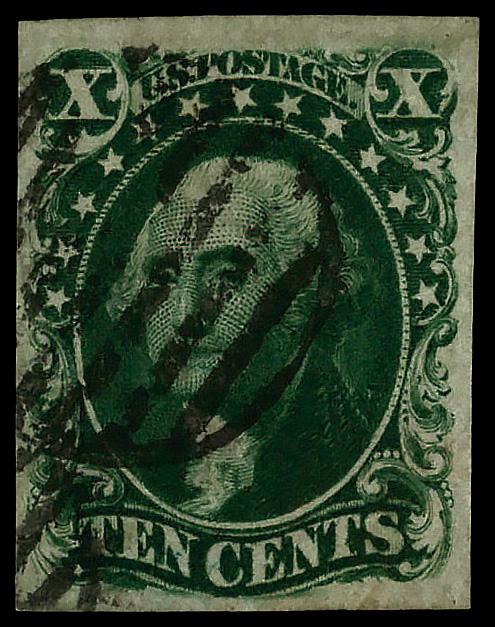 1859, 10¢ green, type V (Scott 35); short perfs at top, Very Fine to Extremely Fine, with 2025 P.F. certificate. Scott $55. (Image)