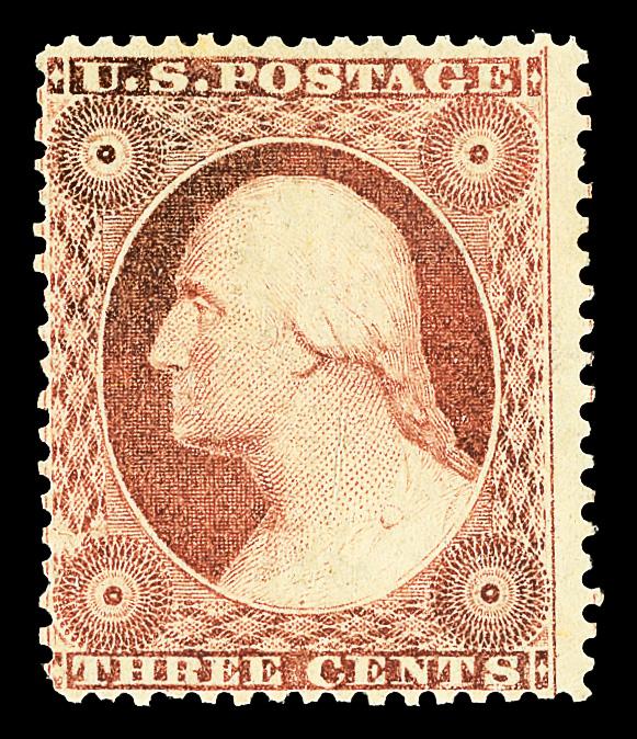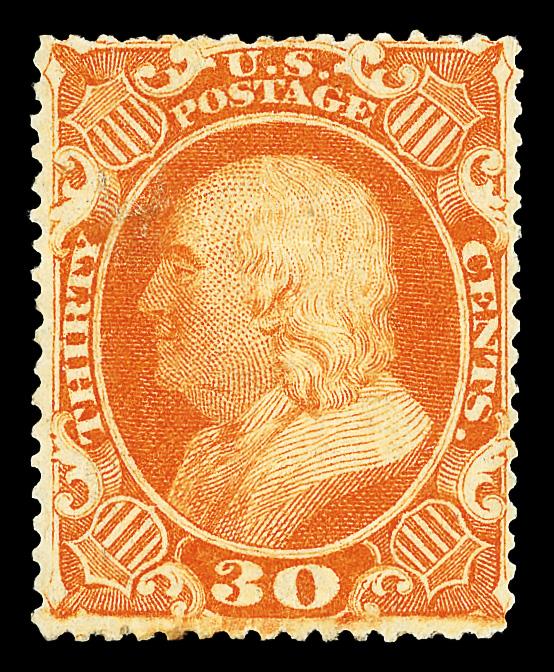 1860, 30¢ orange (Scott 38), single, Very attractive stamp., o.g., hinged; Reperforated at the right, Fine to Very Fine, with 2018 P.S.E. certificate. Scott $1,900. (Image)