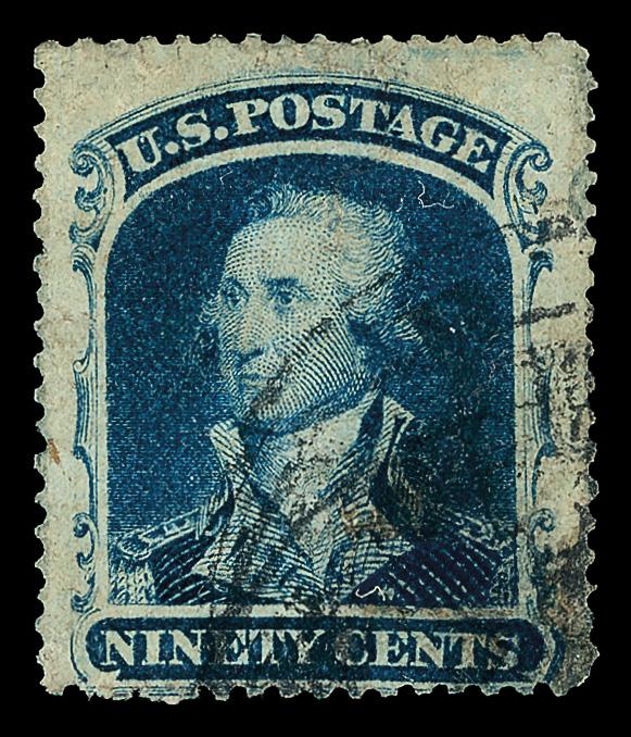 1860, 90¢ blue (Scott 39), single; has filled thins and fake cancel added., Fine, with 2025 A.P.E.X. certificate. Scott $3,000. (Image)