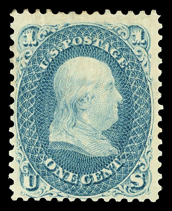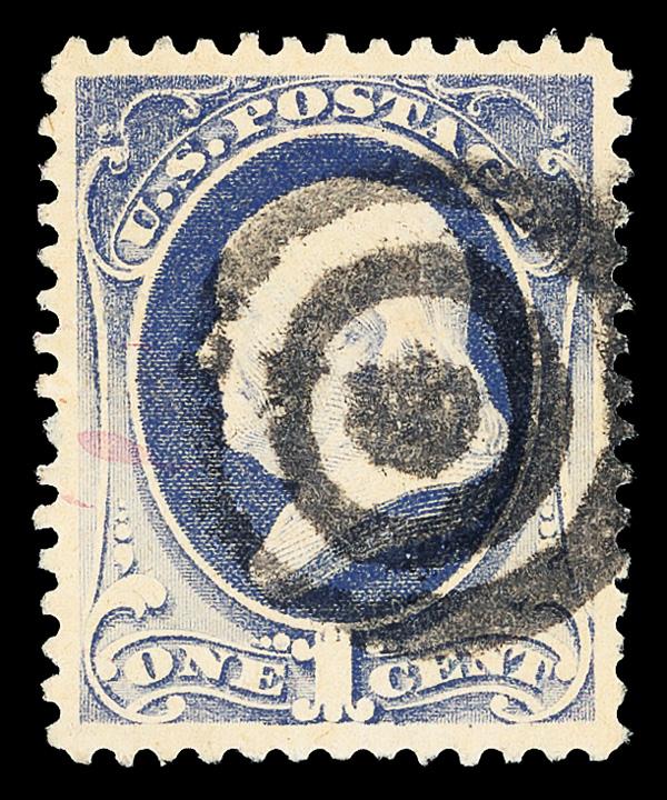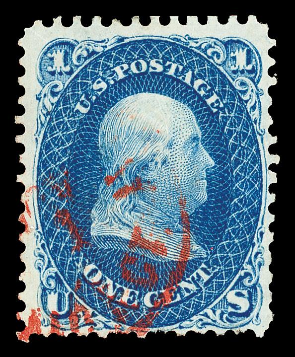 1861, 1¢ blue (Scott 63), single, Bright blue example with red c.d.s. cancel.; minor perforation faults at bottom, Fine to Very Fine, with 2019 P.S.A.G. certificate. Scott $60. (Image)