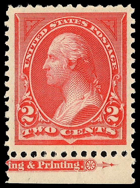 1894, 2¢ rose, type I, unwatermarked (Scott 250a), bottom margin part imprint single, o.g., very lightly hinged, beautifully centered jumbo in rich color on immaculate paper, Extremely Fine, with 1999 P.F. certificate as #250. Scott $40. (Image)