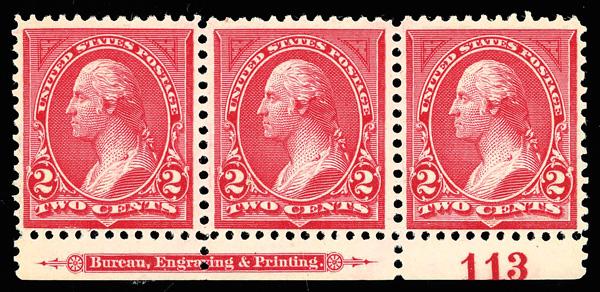 1895, 2¢ carmine, type I, D.L. watermark (Scott 265), plate number strip of 3, o.g., never hinged, Fine to Very Fine. Scott $325. (Image)