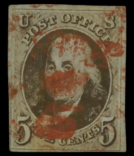 1847, 5¢ red brown (Scott 1), red cancel, Fine to Very Fine. Scott $425. (Image)