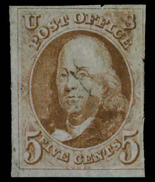 1847, 5¢ orange brown (Scott 1b), pen cancel; corner crease UR, Fine. Scott $250. (Image)