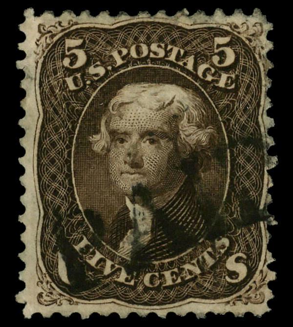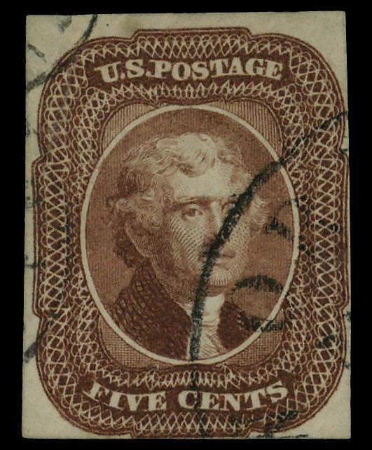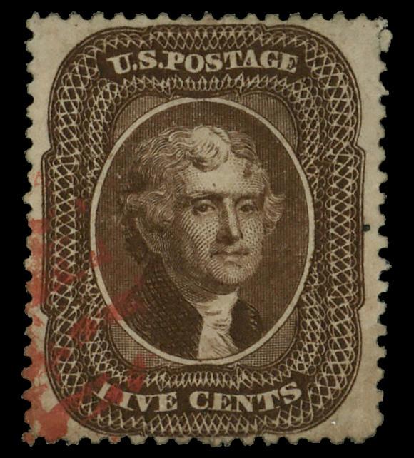 1860, 5¢ brown, type II (Scott 30A), red cancel, Fine to Very Fine. Scott $450. (Image)