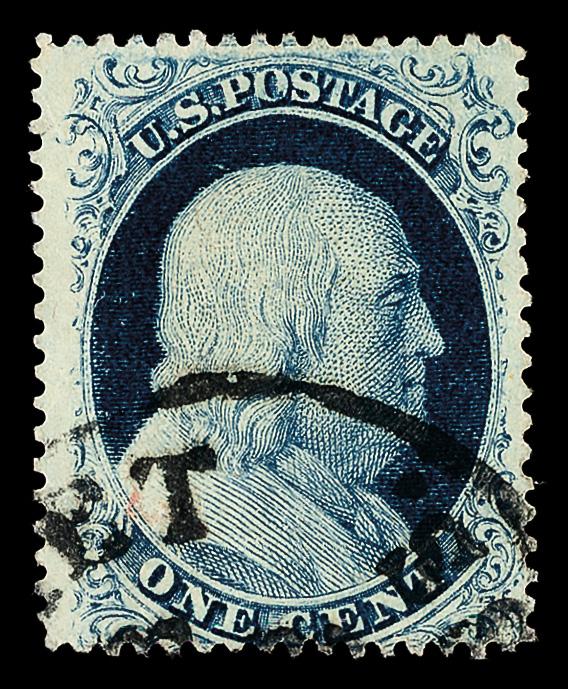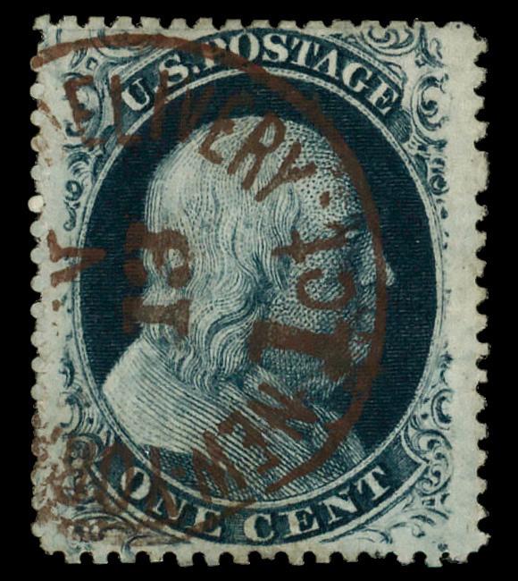 1857, 1¢ blue, type V (Scott 24), red carrier cancel, Very Fine. Scott $60. (Image)