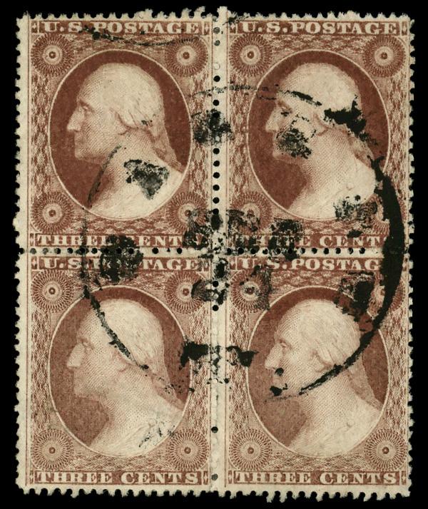 1857, 3¢ dull red, type III (Scott 26), block of 4, Very Fine. Scott $175. (Image)