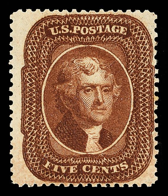 1861, 5¢ orange brown, type II (Scott 30), o.g., lightly hinged, sound and fresh with deep, rich color, clearly showing type characteristics at top and bottom, Very Fine, with 1984 P.F. certificate. Scott $1,500. (Image)