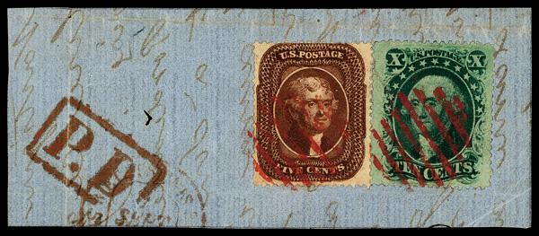 1861, 5¢ orange brown, type II (Scott 30), used on piece of folded letter with red grid cancels, 10¢ with diagonal crease, Fine to Very Fine, with 1989 P.F. certificate. Scott $1,438. (Image)