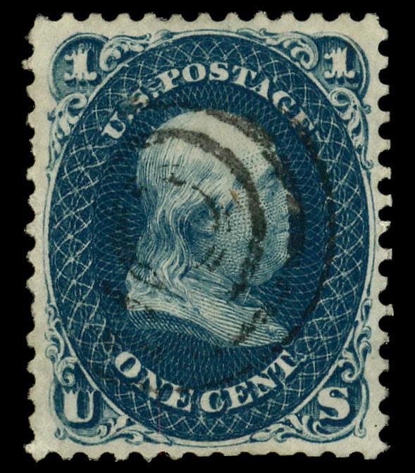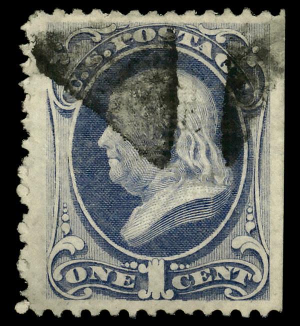 1870, 1¢ ultramarine, H. grill, N.B.N.C. printing (Scott 134); straight edge at right, Very Fine to Extremely Fine. Scott $210. (Image)