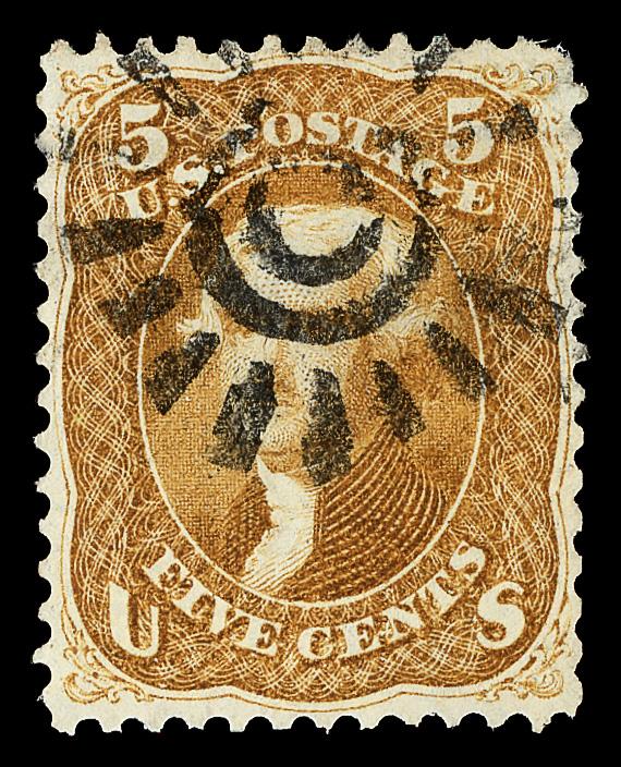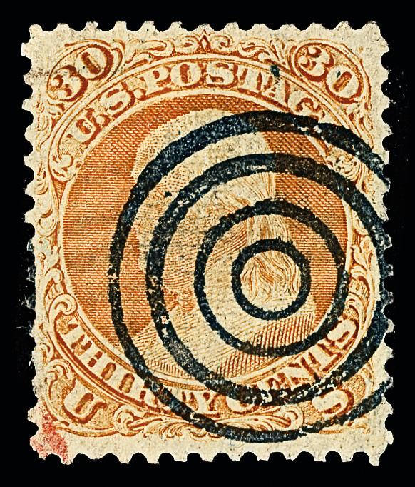 1867, 30¢ orange, F. grill (Scott 100), fresh and bright with blue target cancel and partial red transit at lower left, all perforations present and full, Fine, with 2017 P.S.E. certificate graded F 70. SMQ F 70; $450. Scott $1,050. (Image)