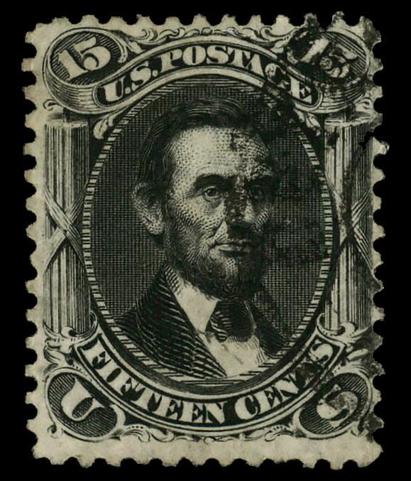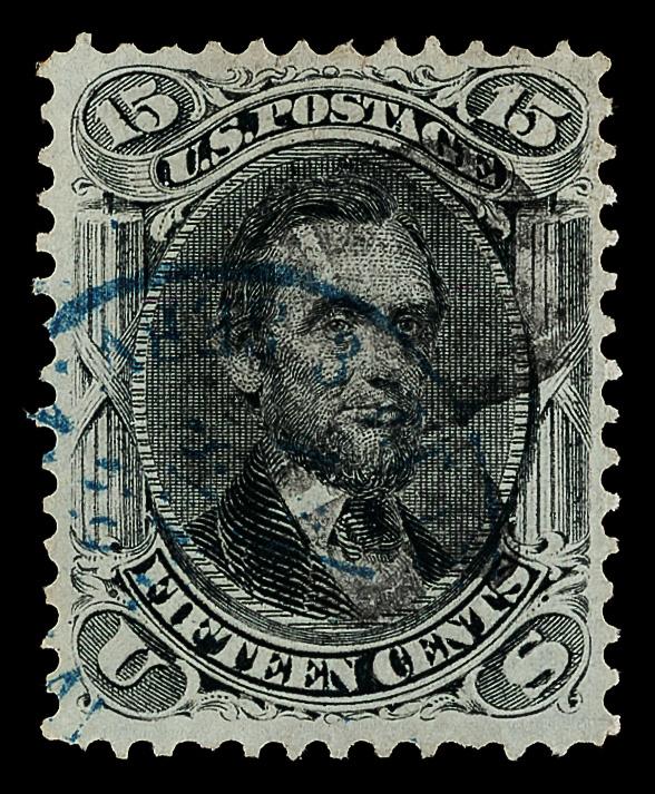1867, 15¢ black, F. grill (Scott 98), sound with clean impression in crisp color; light black cork and partial blue foreign transit cancels, Very Fine, with 2025 P.F. certificate. Scott $300. (Image)
