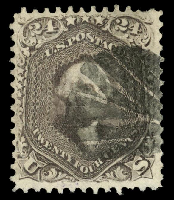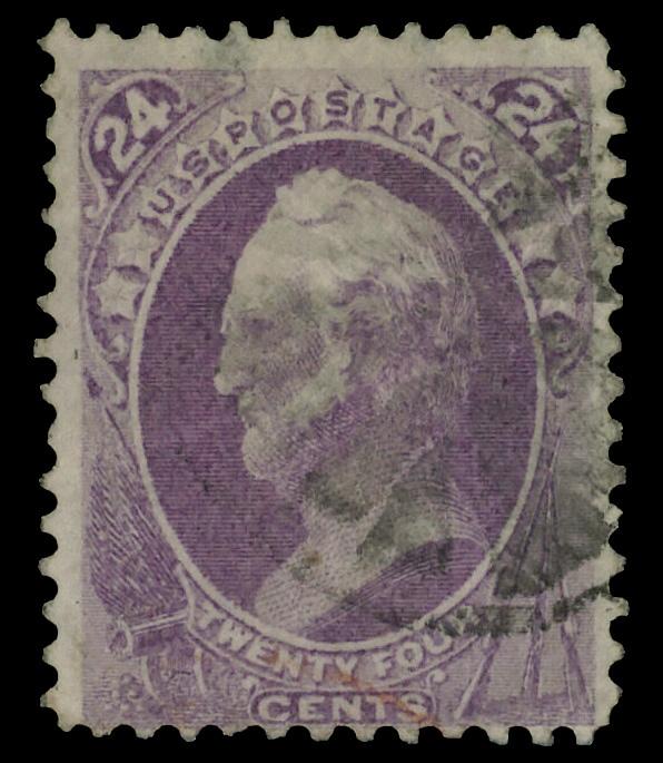 1870, 24¢ purple, without grill, N.B.N.C. printing (Scott 153), light black cancel & faint red cancel; light crease, Very Good to Fine. Scott $240. (Image)