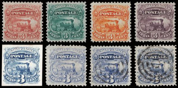 3¢ Locomotive, Small specialized group (Scott 114 etc.), eight items: four different small numeral essays (114-E6d, no gum), one plate proof on card (114P$), one unused single (without gum), and two Extremely Fine used singles, Very Fine to Extremely Fine. Scott $527. (Image)