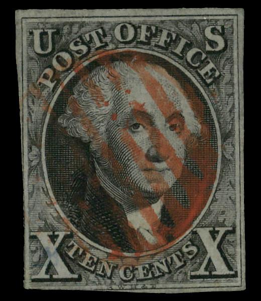 1847, 10¢ black (Scott 2), red cancel, Very Good to Fine. Scott $850. (Image)