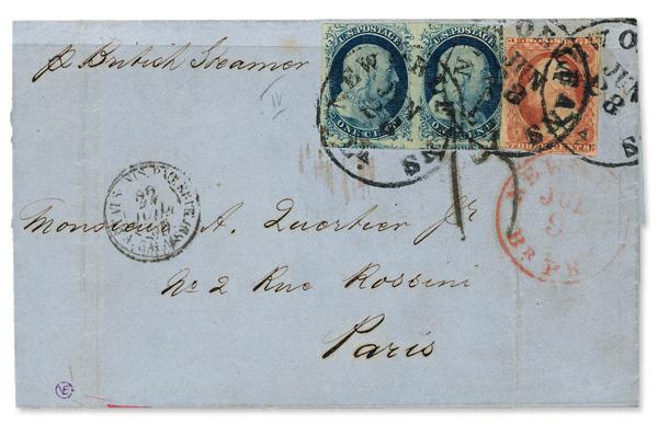 1852, 1¢ blue, type IV (Scott 9 & 11), Horizontal pair used with 3¢ dull red (#11), all tied by 'New Orleans Jun. 23 (1856)' postmarks on folded letter to Paris, red 'New York Br. PKT. JUN 9' and black French transit marks, manuscript 'per British Steamer'. Vertical file fold through 3¢ stamp., Fine to Very Fine, with 2025 P.F. certificate. Scott $268. (Image)