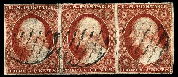1852, 3¢ dull red, type II (Scott 11A), horizontal strip of 3, Positions 22-24R5L with rust marks at positions 23-24R5L, grid cancels; right stamp tear & crease at bottom, Fine to Very Fine, with 2025 P.F. certificate. Scott $140. (Image)