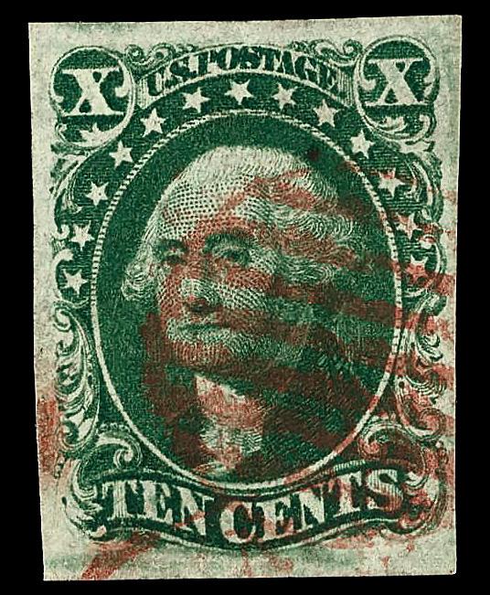 1855, 10¢ green, type II (Scott 14), red grid cancel, 3 large margins, Fine to Very Fine, with 1984 P.F. certificate. Scott $170. (Image)