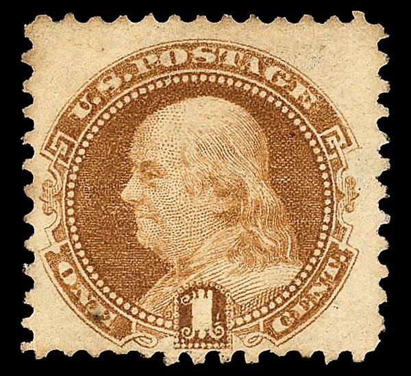 1869, 1¢ buff (Scott 112), small part o.g. (paper inclusion); lightly toned, Fine, with 2025 P.F. certificate graded F 70. SMQ F 70; $300. Scott $600. (Image)