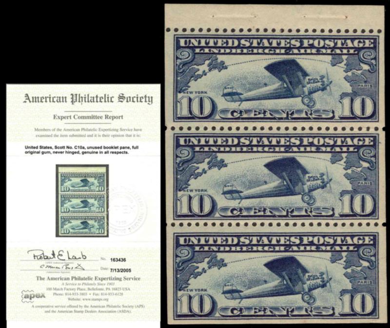 1927 Scott C10a, 10c Lindbergh Booklet pane of three with APS Certificate. Mint never hinged. (Inv USAC010aS06) (Image)