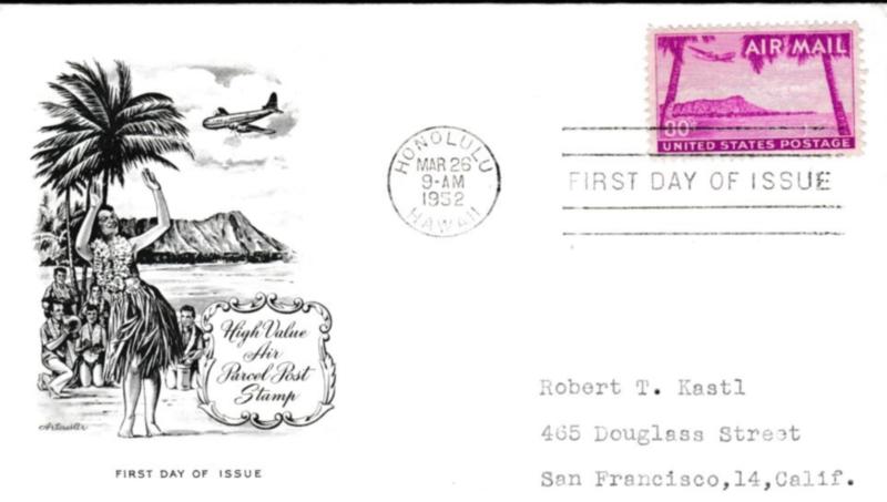 1952 Scott C46, 80c Hawaii 1952 Honolulu, Hawaii First Day of Issue Airmail to San Francisco, Calif. Artmaster cachet Mellone C46-3. Typewritten Address. (Inv USAC046C10) (Image)