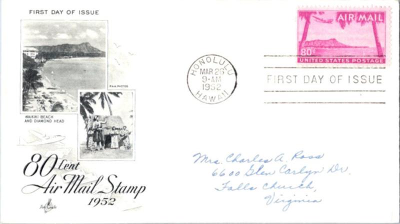 1952 Scott C46, 80c Hawaii Air Mail 1952 Honolulu, Hawaii First Day of Issue Air Mail to Falls Church, Virginia. Art Craft cachet Mellone #2. Ink address. (Inv USAC046C18) (Image)