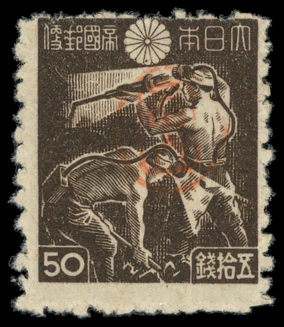 Miyako District, 1947, Postmaster Tomiyama's handstamped seal on Coal Miners, 50s dark brown (Scott 3X22), without gum as issued, Very Good to Fine. Scott $150. (Image)