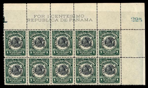 1909, 1c dark green & black 'CANAL/ZONE' reading up (Scott 31), corner margin block of 10 with imprint & registration #., o.g., never hinged, Very Fine. Scott $43. (Image)