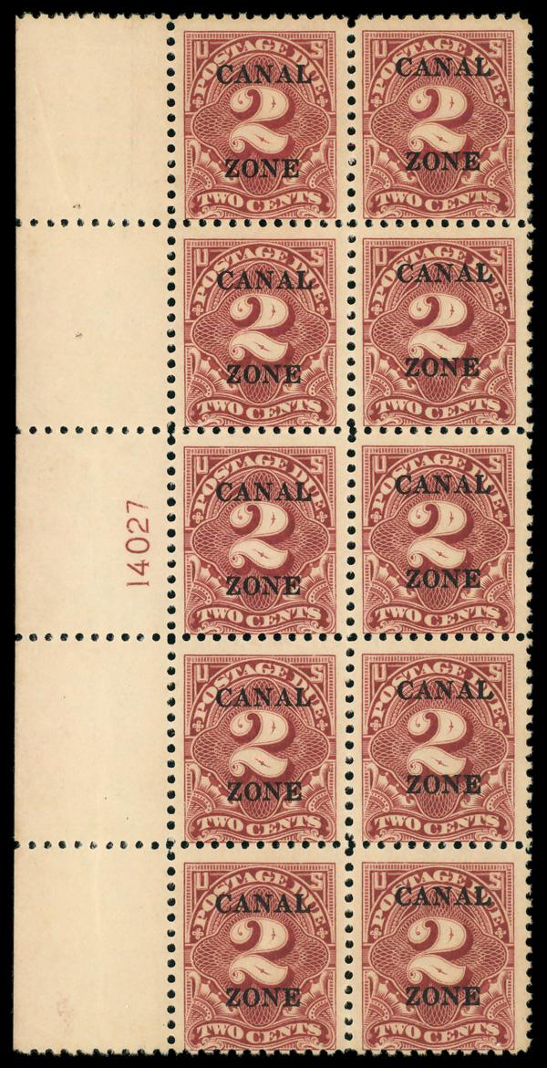 Postage Due, 1925, 2c carmine rose 'CANAL/ZONE' overprint (Scott J19), plate block of 10, disturbed o.g., Fine. Scott $160. (Image)